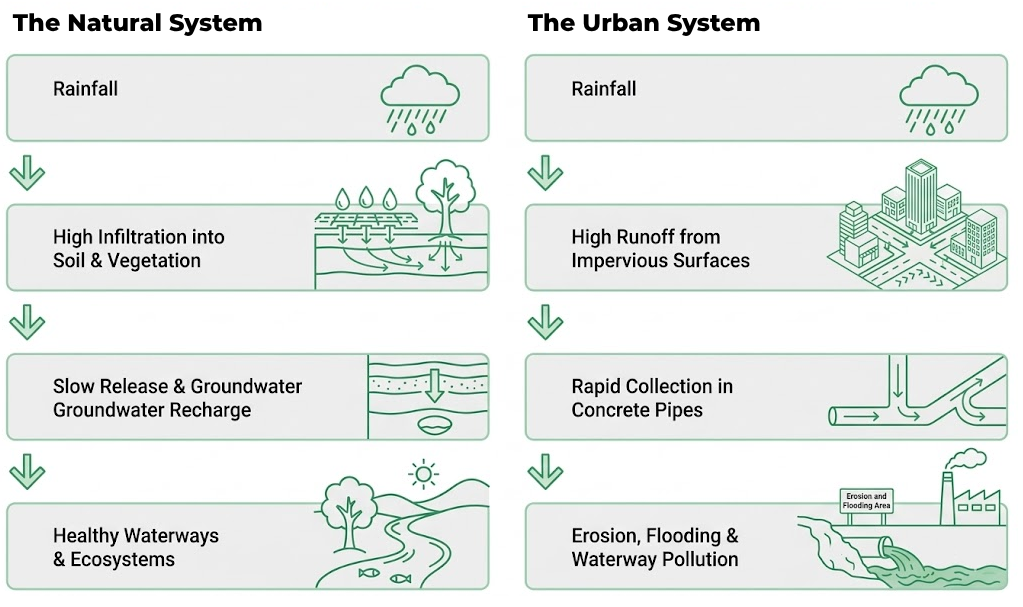Australian civil infrastructure design, much like early agriculture, was imported from Britain in colonial times. Directing all runoff into drains has been proven to degrade the landscape in agricultural settings: the exact opposite of what the land needs. Regenerative agriculture emerged to address this, demonstrating significant landscape restoration through natural interventions.